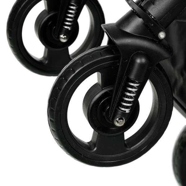 Колелата от EVA пяна (8” предни и 10” задни) не се пукат, не изискват поддръжка и осигуряват меко возене.